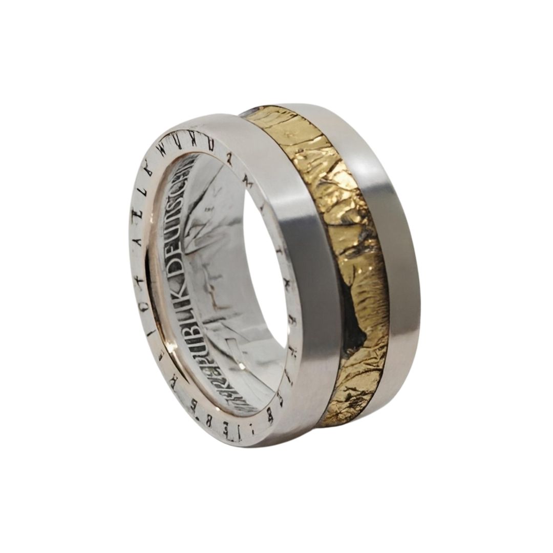 Dieser personalisierte Silberring mit exklusiver Münzprägung vereint historische Symbolik mit edlen Materialien. Gefertigt aus einer originalen 10 DM Münze oder 10 Euro Münze, entsteht in sorgfältiger Handarbeit ein außergewöhnlicher Münzring mit feinem Turmalin-Inlay und 24-karätigem Blattgold.